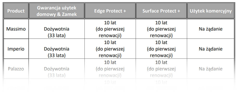 Czas trwania gwarancji zależy od typu laminatu i celów, do jakich jest on używany, jak wskazano w powyższej tabeli. Określenie „zastosowania domowe” należy rozumieć jako: użycie laminatu jako podłogi w prywatnej nieruchomości, która służy wyłącznie do celów prywatnych.